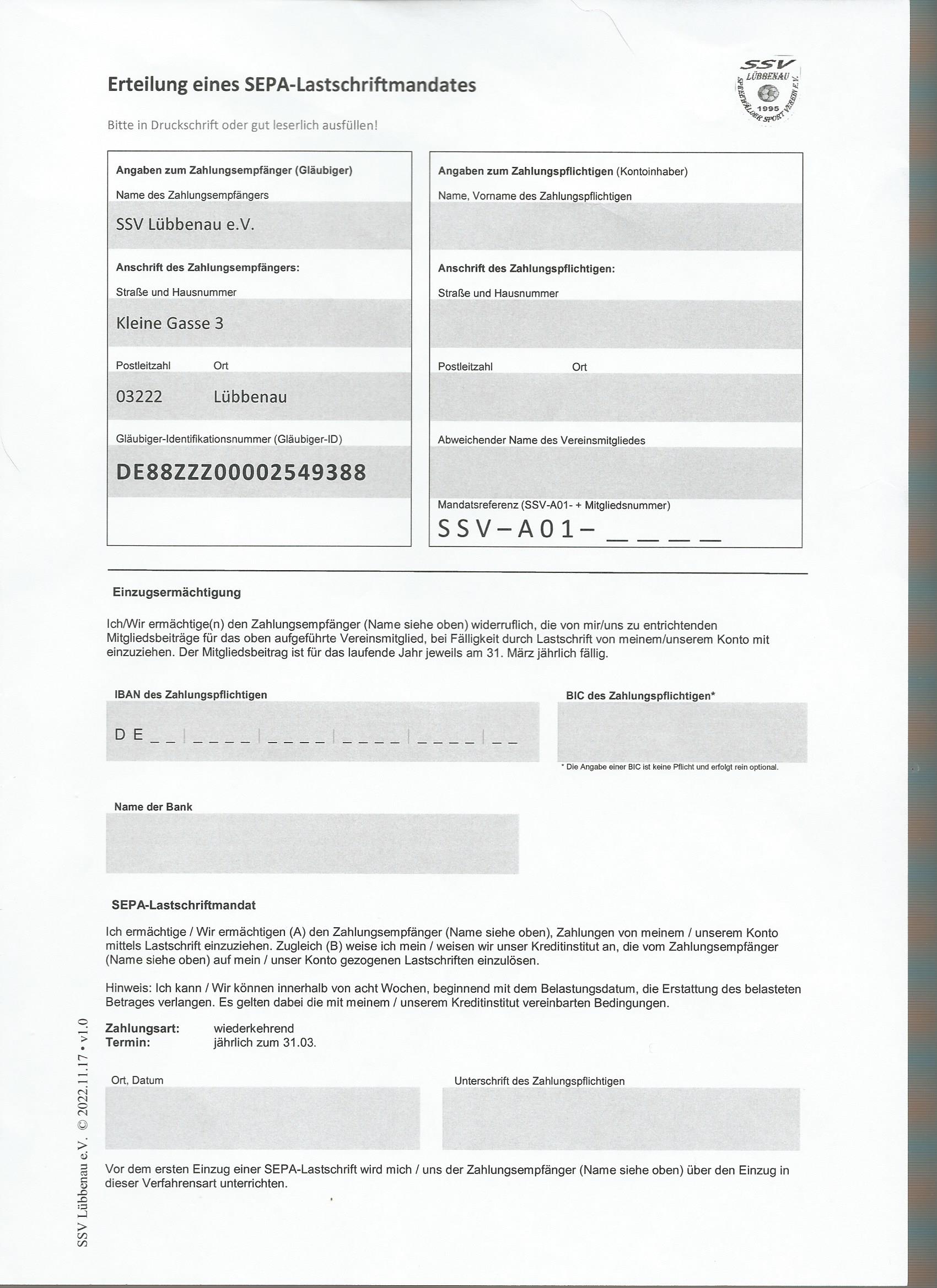 Dann drucke den Antrag sowie die Erteilung des Lastschriftmandats aus, fülle beide aus und gib sie direkt bei einer verantwortlichen Person ab oder stecke sie in den Briefkasten des Vereins.